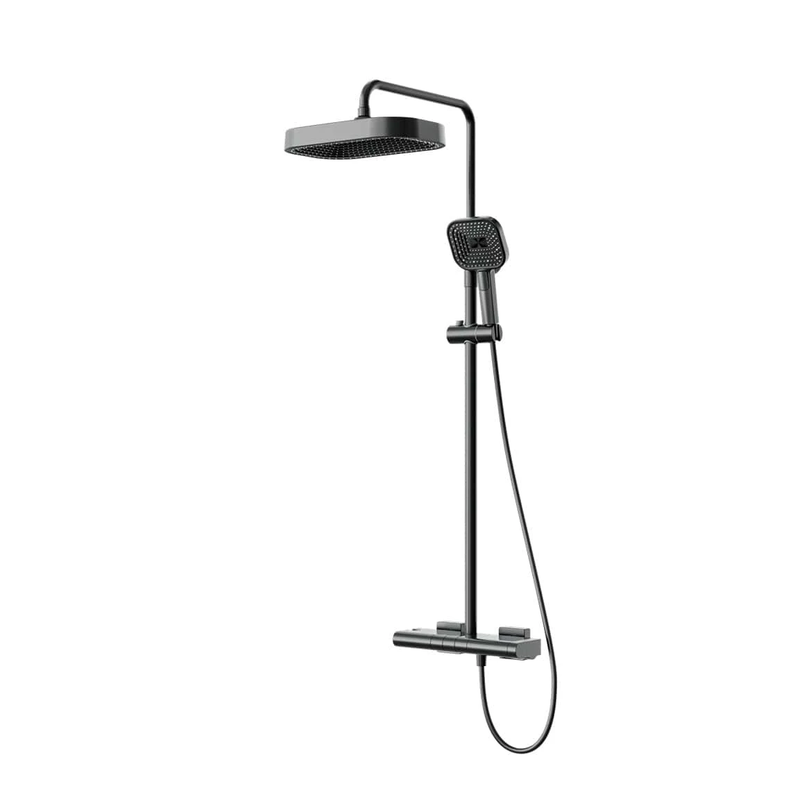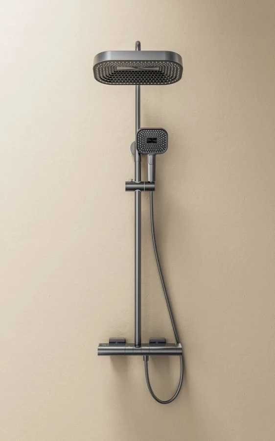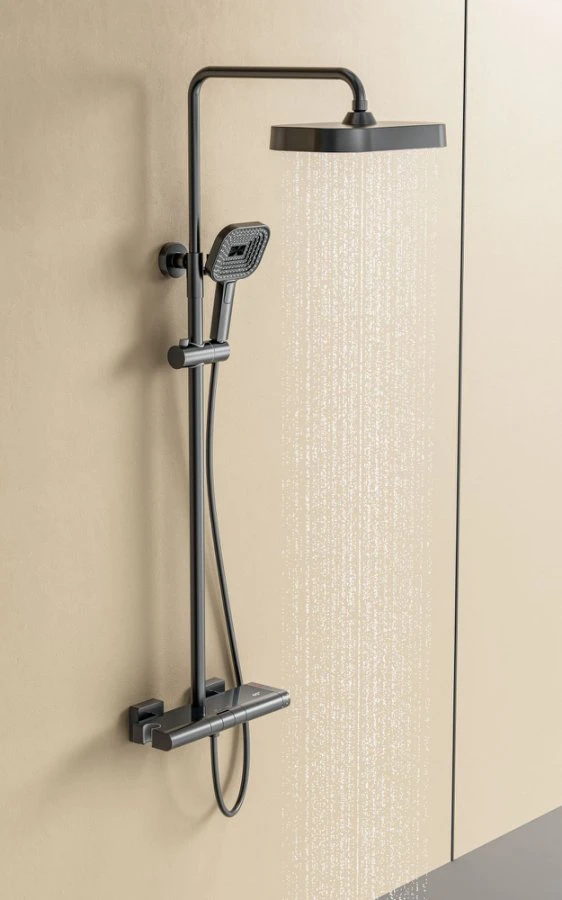 składa się z: główka prysznicowa, bateria termostatyczna z kaskadą, drążek prysznicowy, suwak, wąż prysznicowy