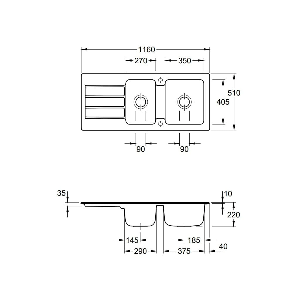 - Średnica otworu pod baterię: 35 mm (Ten zlew nie ma w standardzie nawierconych otworów)