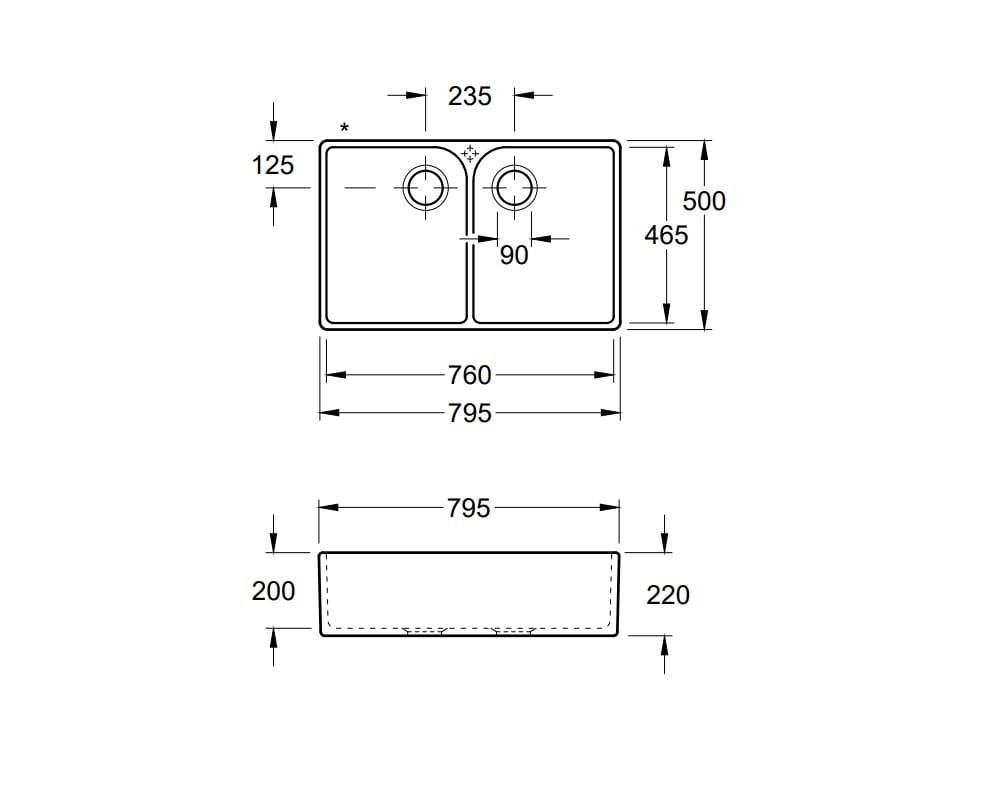 Wymiary zewnętrzne zlewozmywaka: 795x500x220 mm