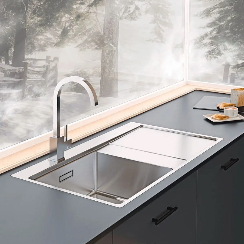 Zlewozmywak wykonany jest ze stali 18/10 (AISI 304) znakomitej ze względu na swą chemiczną obojętność w kontakcie z wieloma rodzajami pożywienia, a także w kontakcie z różnorodnymi detergentami stosowanymi przy jej oczyszczaniu.