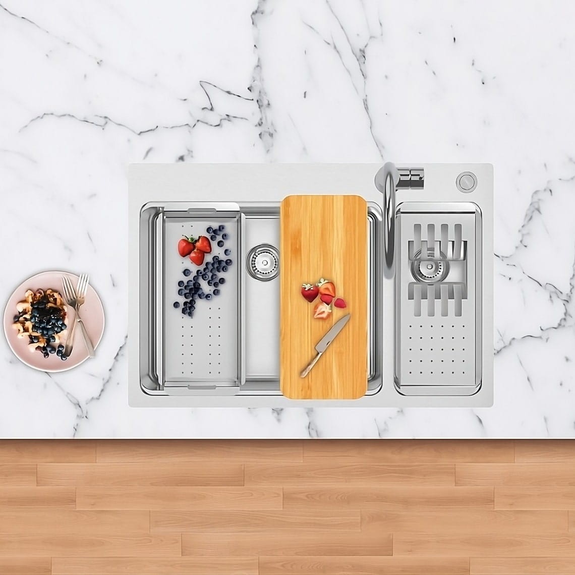 Zawiera VERSUS, wielofunkcyjne akcesorium, które może służyć jako deska do krojenia lub jako ociekacz.