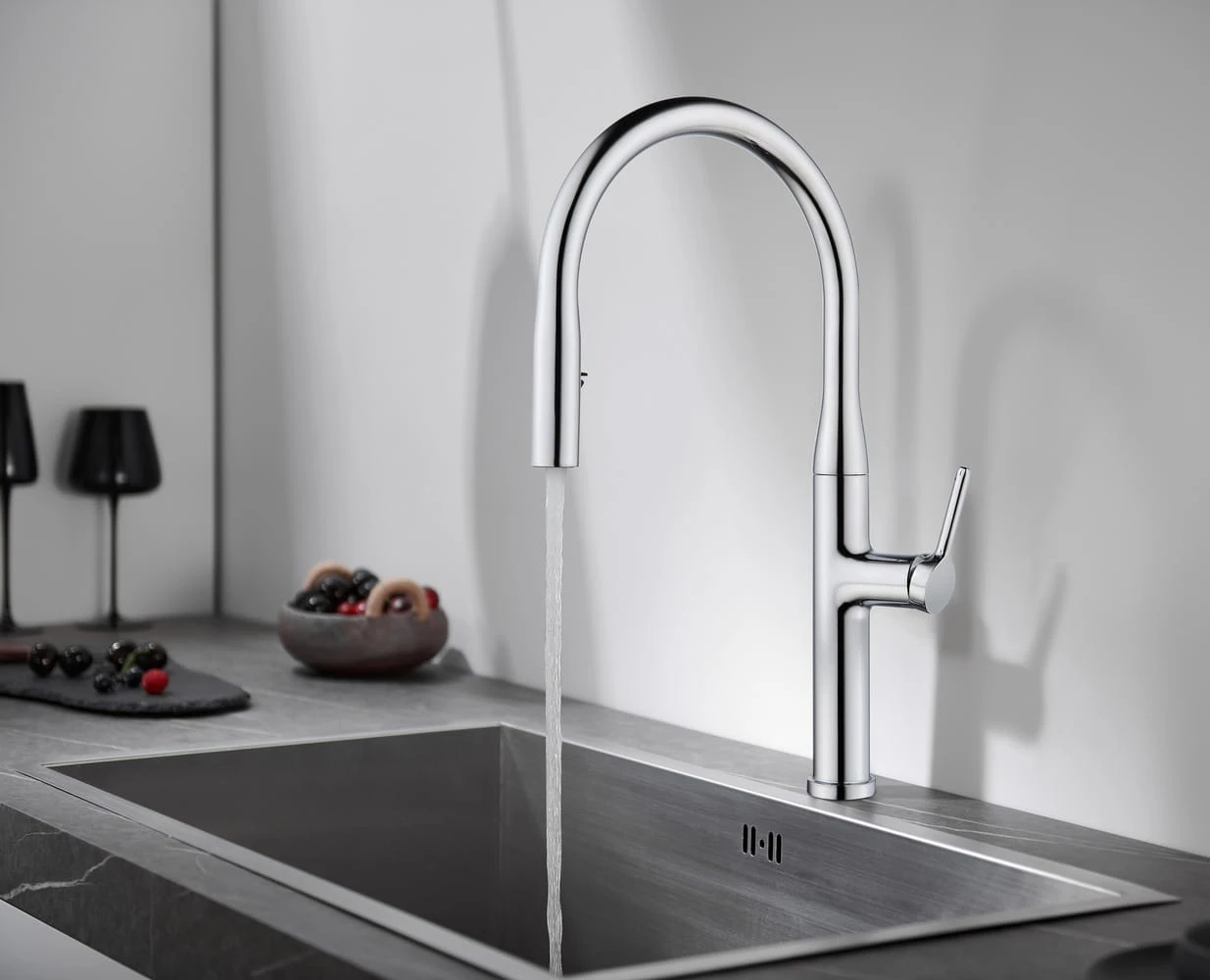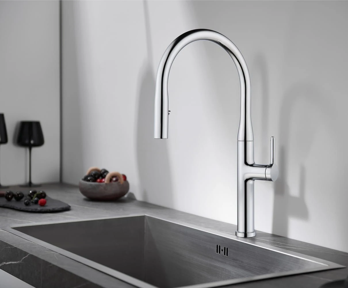 Opuszczany kran z wężem zapewnia elastyczne dostarczanie wody i łatwe zwijanie węża.