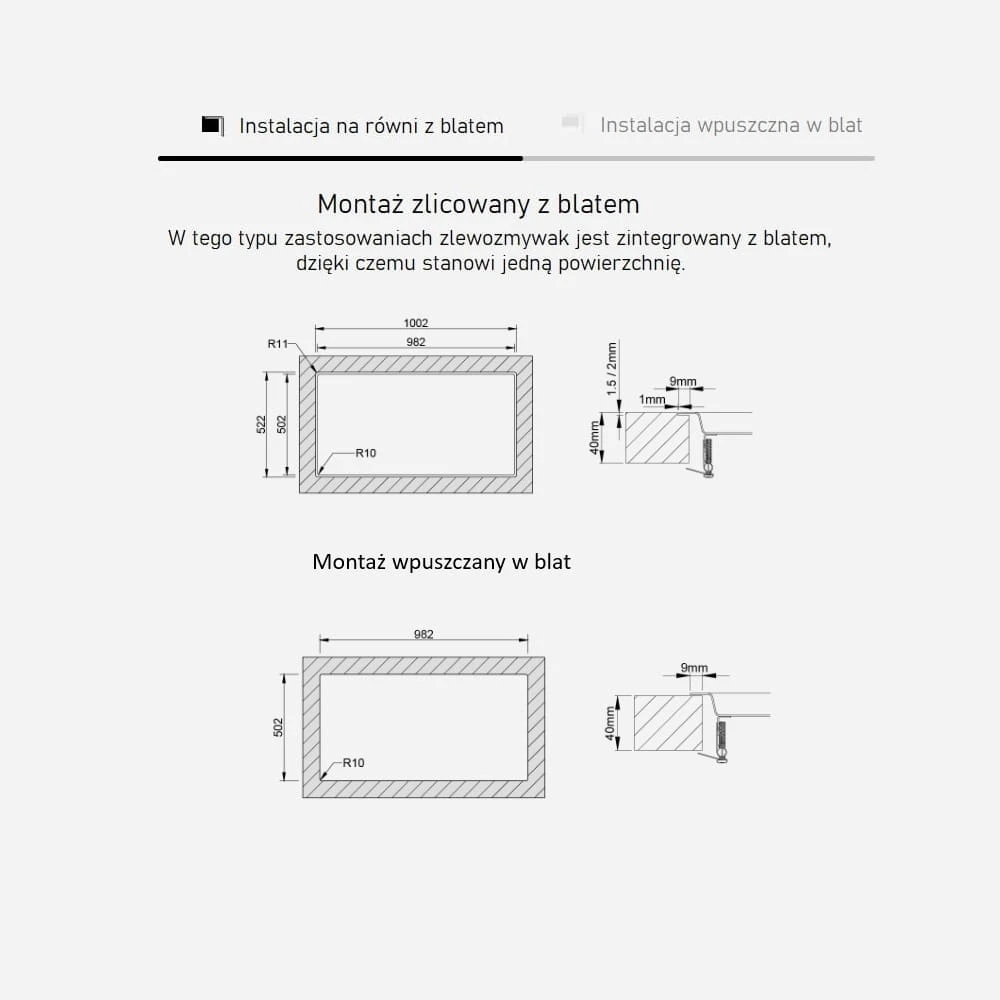 Sposób montażu: wpuszczany lub na równi z blatem